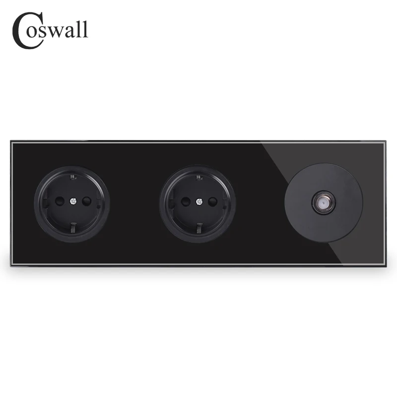 Coswall Tempered Pure Glass Panel 16A Double EU Standard Wall Power Socket + 1 Gang Satellite Conne